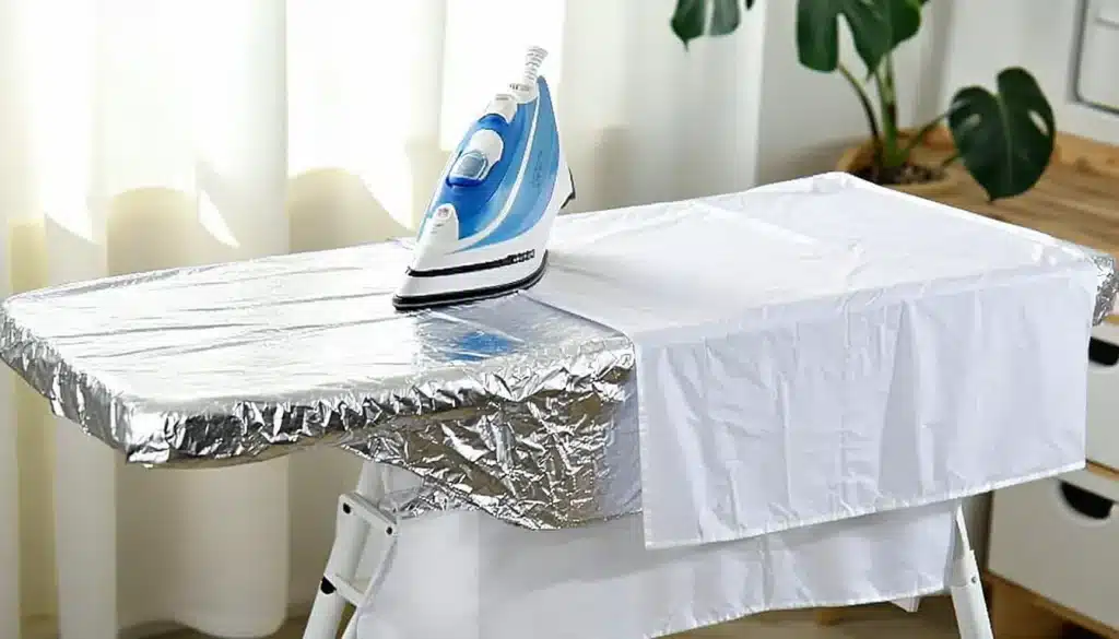- Nehmen Sie den Bezug vom Bügelbrett ab und legen Sie ein Stück Aluminiumfolie (mit der glänzenden Seite nach oben) so auf, dass es die Oberfläche des Bügelbretts bedeckt.